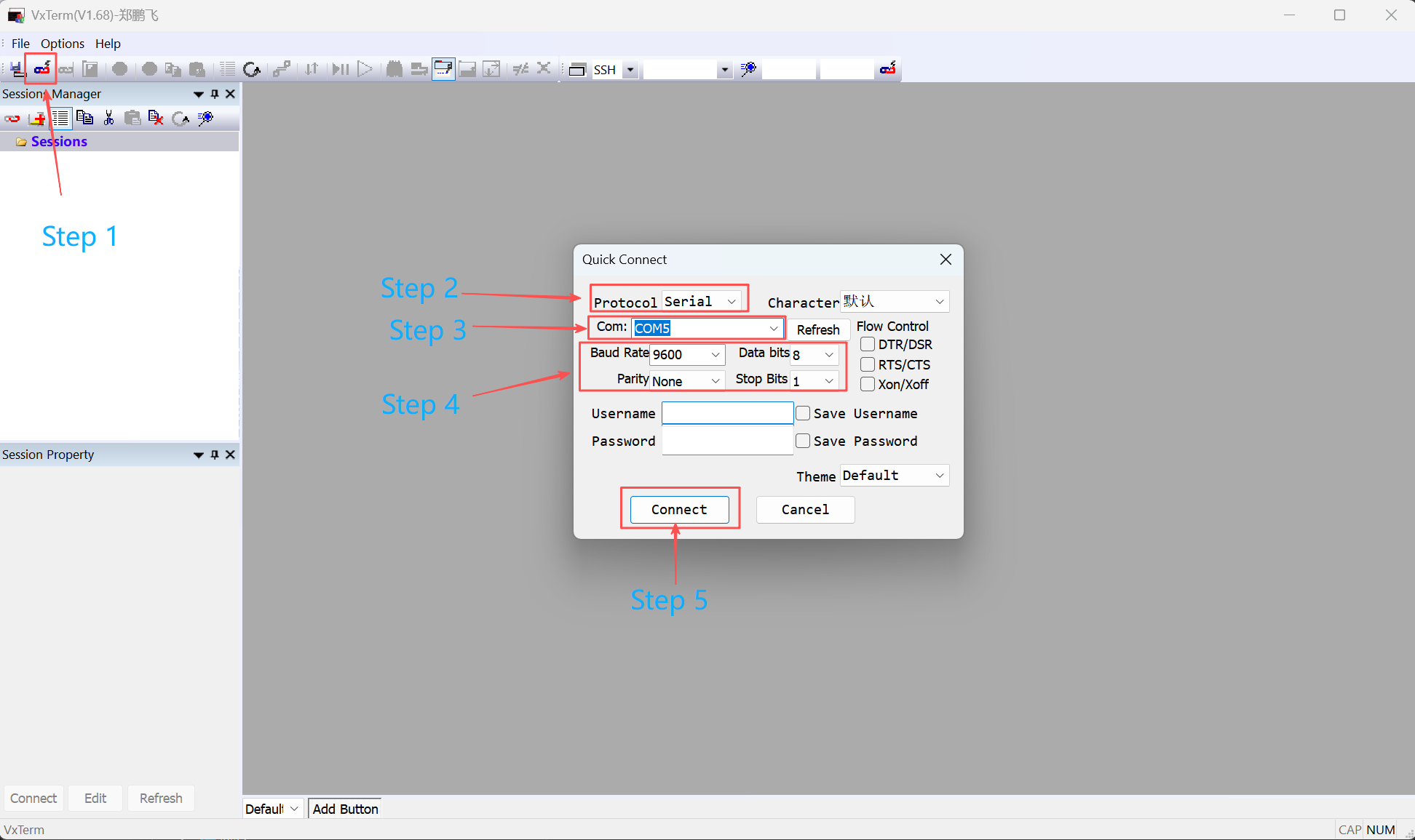 - Click the Quick Connect button on the toolbar.