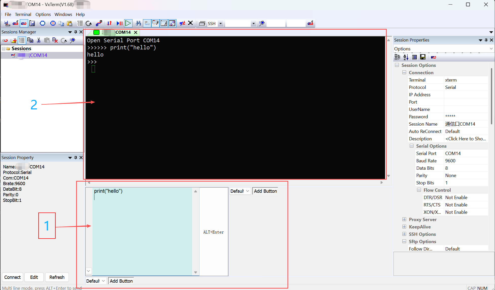 - Type a command in the input box and press Enter, then press Alt+Enter to send the line.